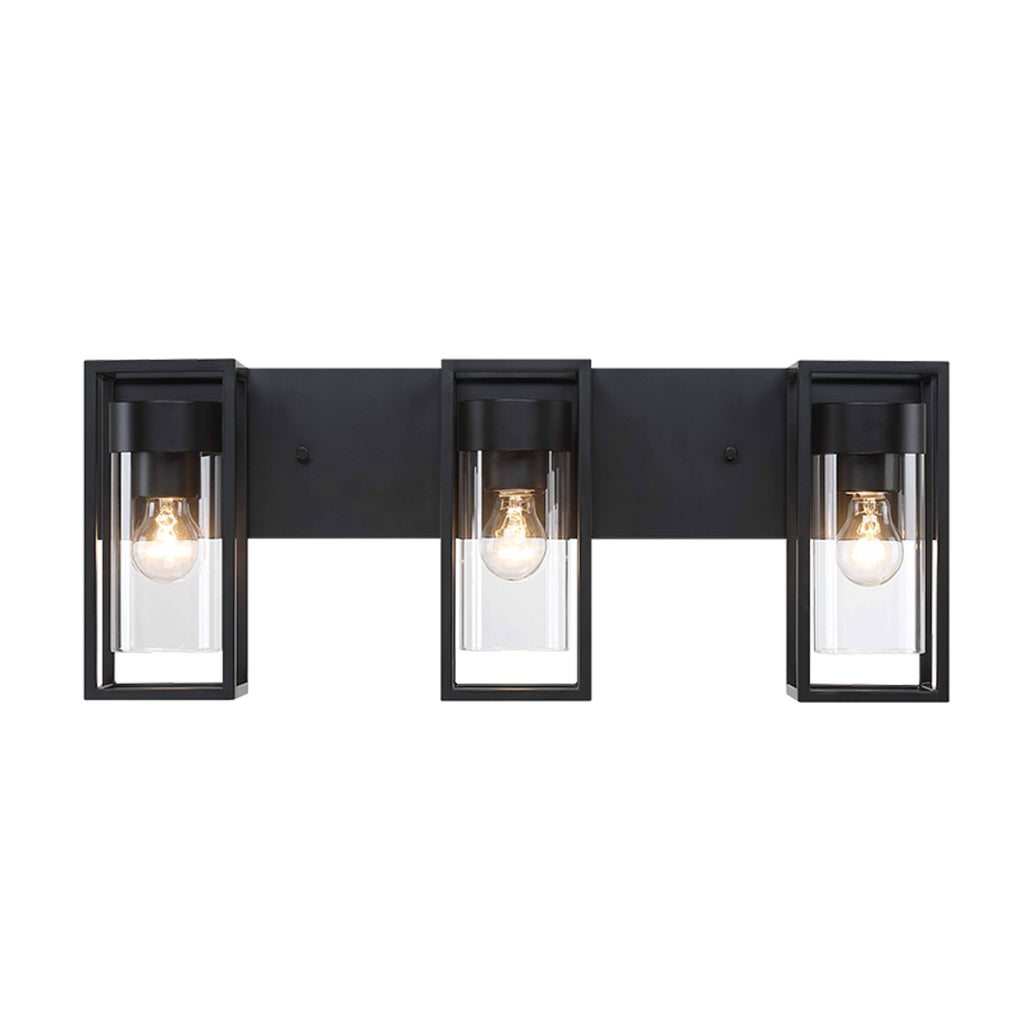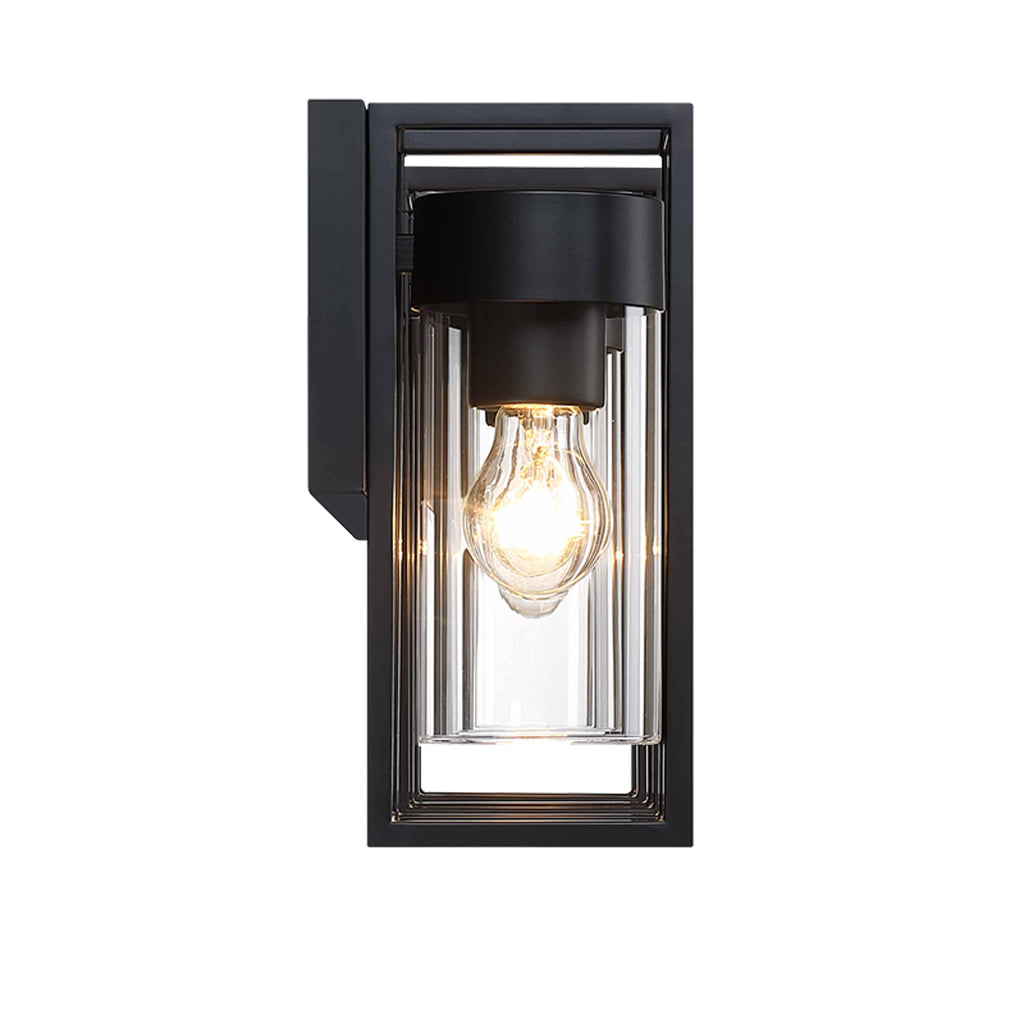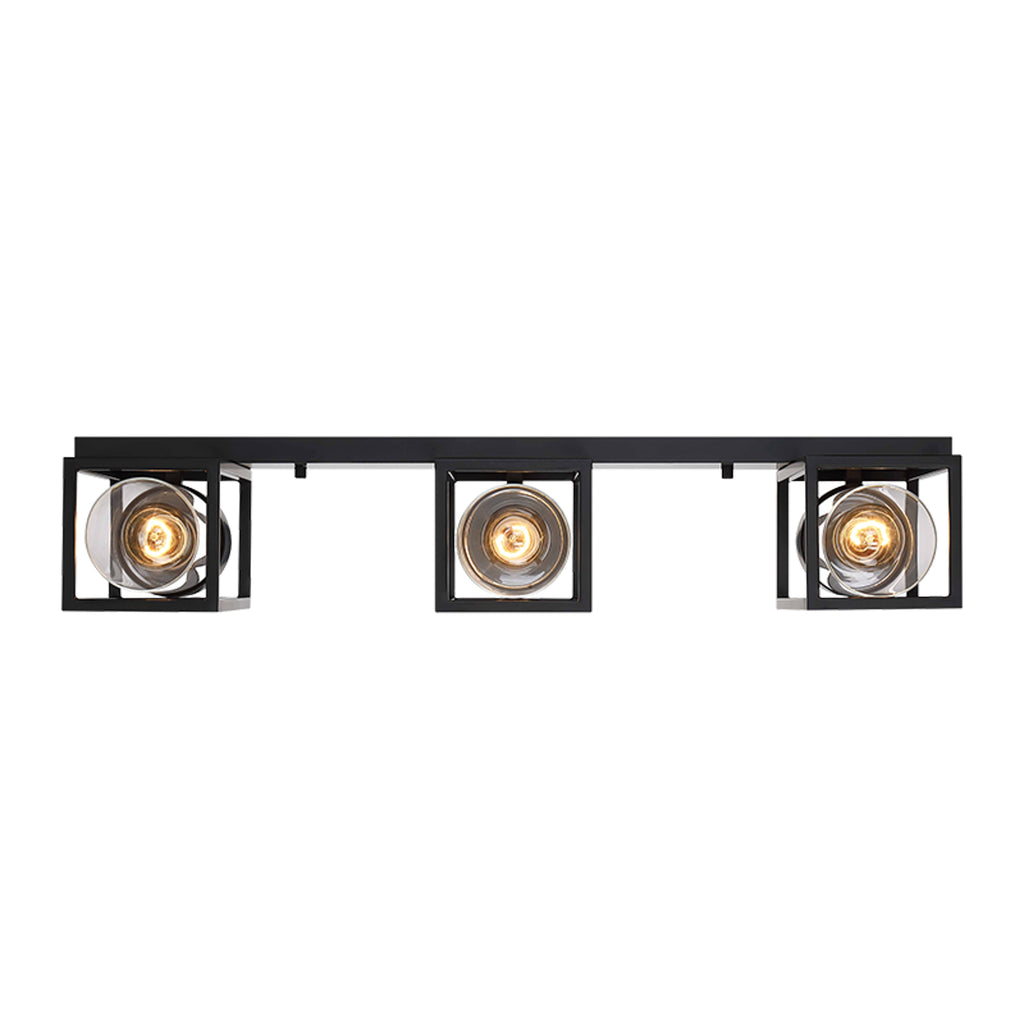 Luminario mural para exteriores con diseño de cuatro lámparas en estructura de hierro negro. Ideal para iluminar fachadas amplias, cocheras o áreas de acceso, ofreciendo un estilo decorativo moderno y elegante.