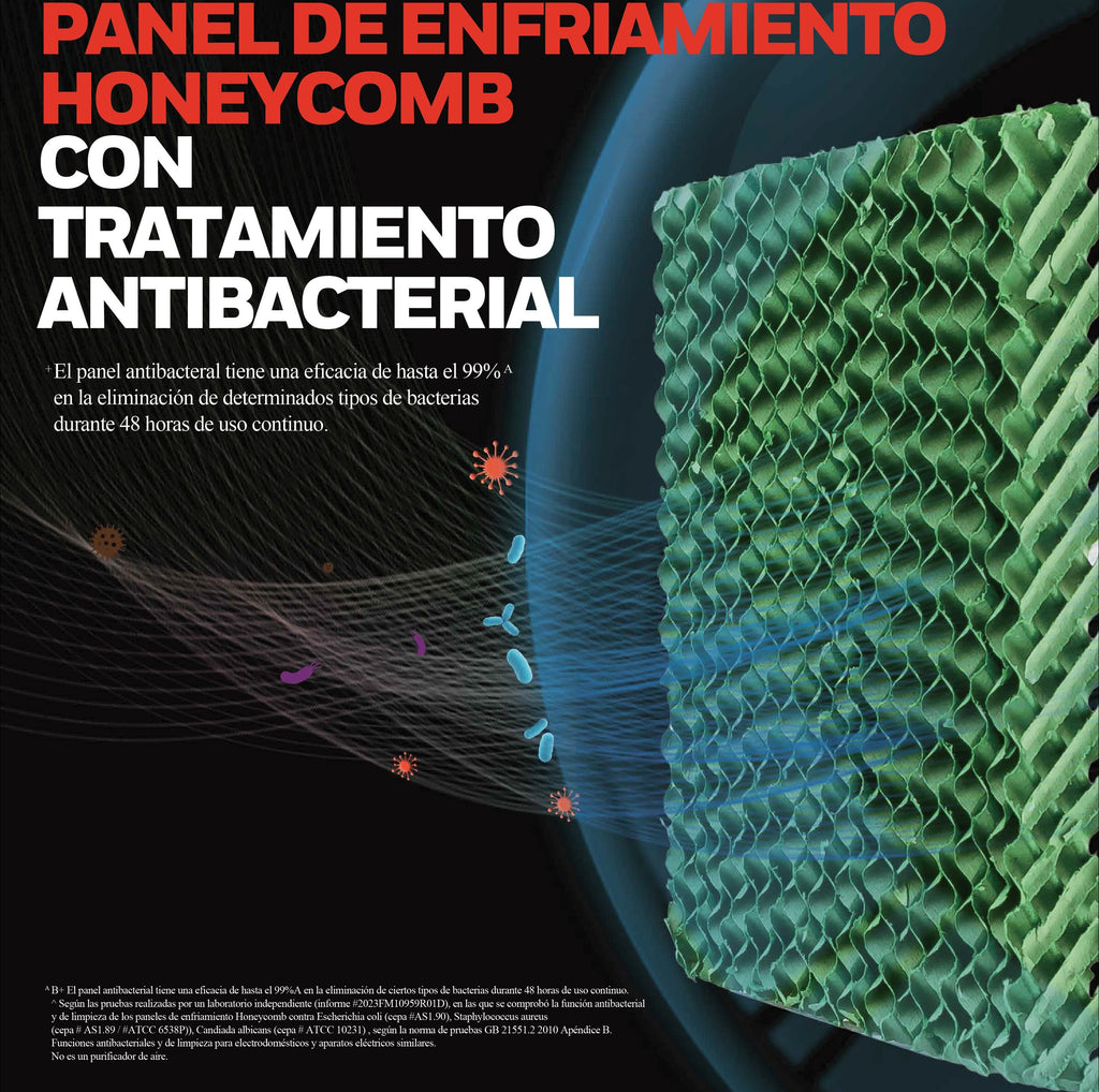 Incorpora tres paneles de enfriamiento Honeycomb con tratamiento antibacterial que ayudan a mantener el aire más limpio mientras reducen la temperatura mediante la evaporación natural del agua.