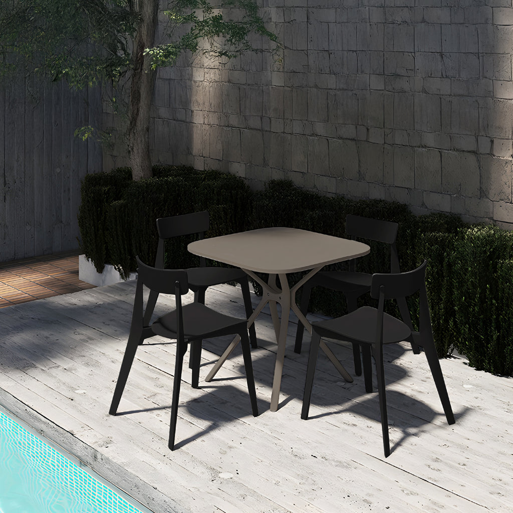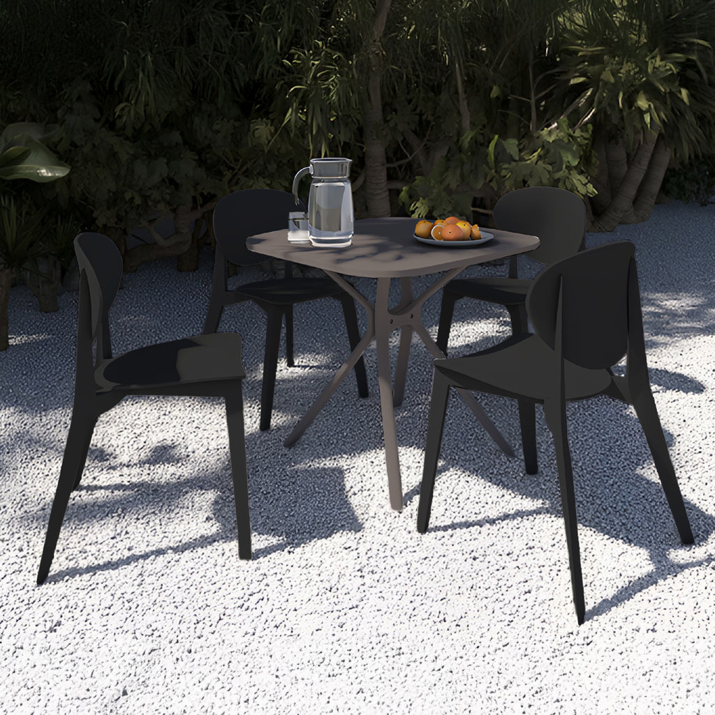 Su estructura está diseñada para soportar condiciones al aire libre, siendo resistente a rayos UV y ambientes salinos, perfecta para terrazas, jardines, cafeterías o áreas de descanso.